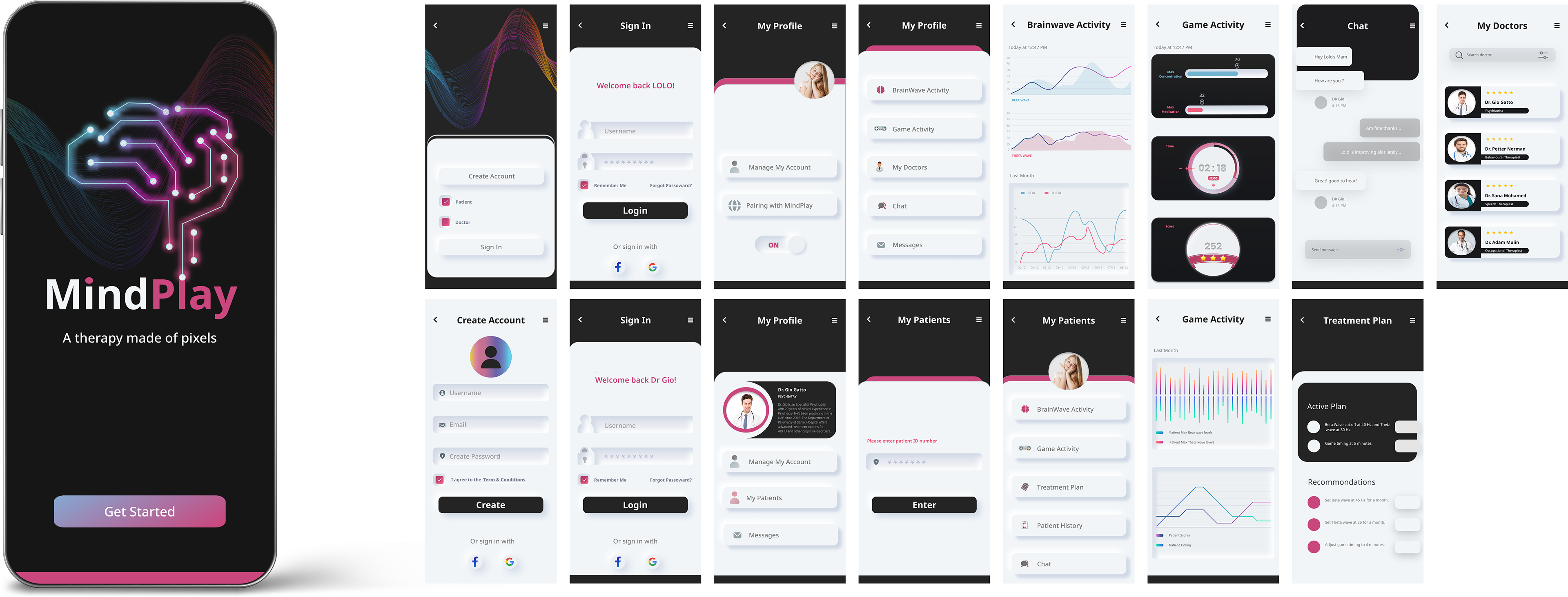 MindPlay is a Product-service system for remotely monitoring and treating ADHD children by utilizing Brain-Computer Interface (BCI) and eye-tracking technologies to augment brain functions (neurofeedback). It is a safe, easy to use from home, cost-effective and engaging alternative to ADHD treatment for patients who have side effects or cannot adhere to medications. It features a high-tech EEG headset, therapeutic game and monitoring app.